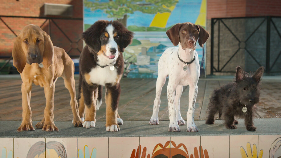Charming stray puppies Luna, Otis, Champ and Haggis find homes with new kid companions — and help a special friend escape a shady research lab.